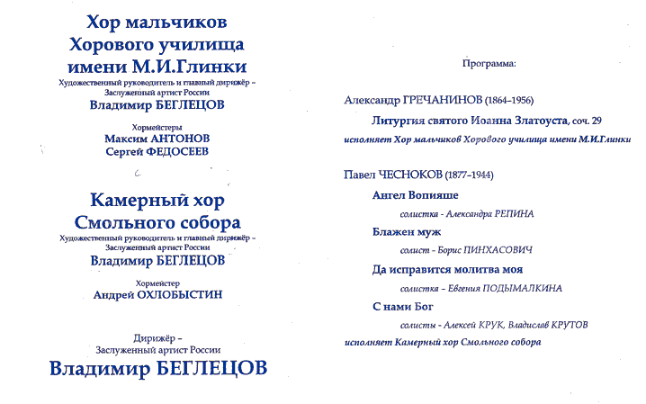 Программа концерта Хора мальчиков в Смольном соборе