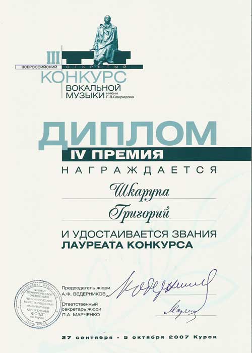 Диплом о награждении Григория Шкарупы IV премией на Конкурсе вокальной музыки им. Г. В. Свиридова в Курске.